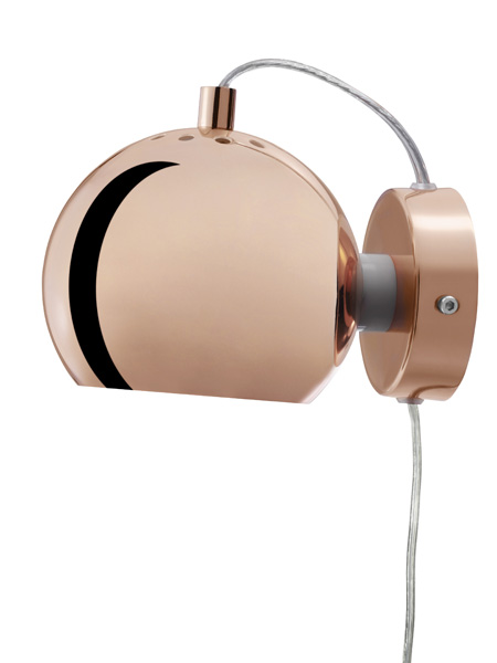 The Frandsen Copper Ball wall light, designed by Benny Frandsen, offers both style and value with a bright polished copper metal finish. The shade directs the light and the on/off switch is located on the transparent cord.